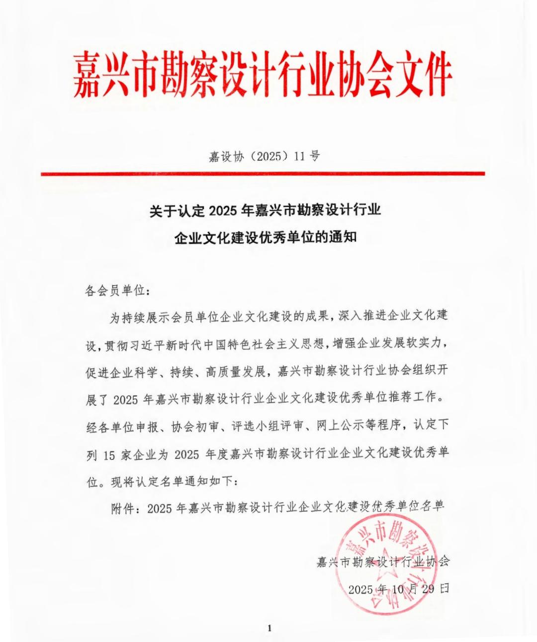 • 我公司荣获“2025年嘉兴市勘察设计行业企业文化建设优秀单位”称号